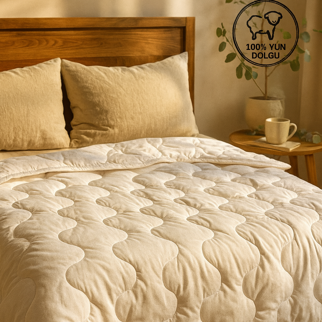 - %100 saf merinos kuzu yünü kullanılarak üretilmiş, uzun ömürlü ve dayanıklı bir yapıya sahiptir.; - 155 x 215 cm boyutlarındaki geniş ebatları ile tek kişilik kullanım için idealdir ve rahat bir uyku deneyimi sunar.; - Pamuklu dış materyali sayesinde cildinize nazik dokunuşlar sağlarken, nefes alabilir yapısıyla terlemeyi minimize eder.; - Yün dolgu malzemesi, doğal ısı yalıtım özellikleriyle mevsim ne olursa olsun konforlu bir sıcaklık sunar.; - Beyaz rengiyle şıklığı ve temizliği ön plana çıkaran bu yorgan, her yatak odasına kolayca uyum sağlar.; - Web renk seçeneği olarak beyaz tonu, modern ve zamansız bir görünüm kazandırırken leke tutmayan yapısıyla pratiklik sunar.; - Type 1 yıkama talimatına uygun şekilde bakım yapıldığında formunu koruyarak uzun süreli kullanım imkanı tanır.; - Ağırlığı 1 - 3 kg arasında değişen hafif tasarımıyla taşıması kolaydır; böylece evde veya seyahatte rahatça kullanılabilir.; - Üretiminde yerli kaynaklardan elde edilen merinos kuzu yünü kullanılarak çevre dostu bir seçenek olarak öne çıkar.